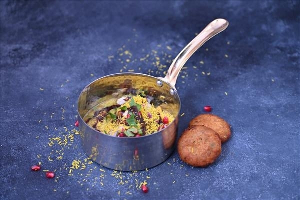 Two potato cutlets topped with yellow pea curry, onions & sweet & spicy sauce. Garnished with coriander, pomegranate, peanuts & fried gram flour strands (Sev)